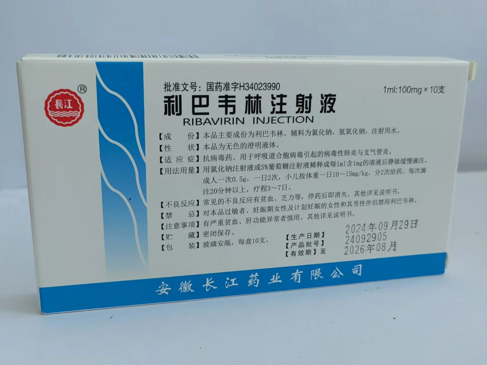 会员可见利巴韦林注射液安徽长江药业有限公司规格:1ml:100mg*10支效期: 件装量:400库存:充裕 中包装:1