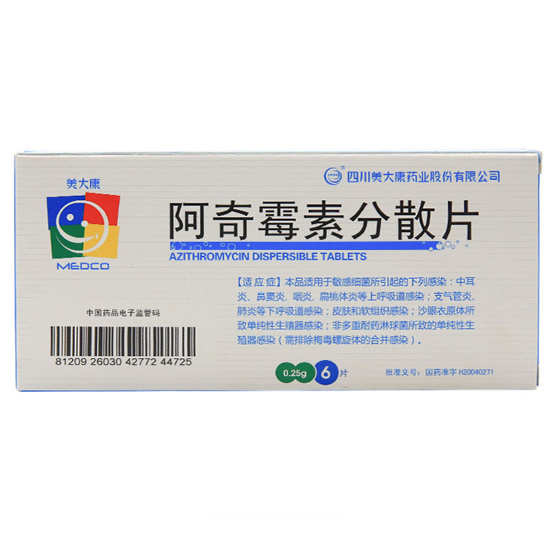 会员可见阿奇霉素分散片四川美大康药业股份有限公司规格:0.25g*6片效期: 件装量:400库存:充裕 中包装:10